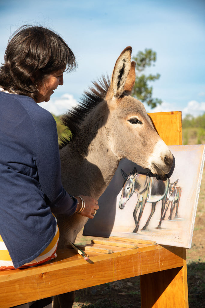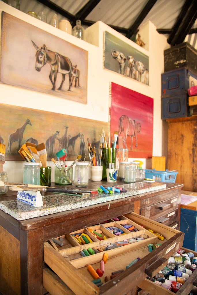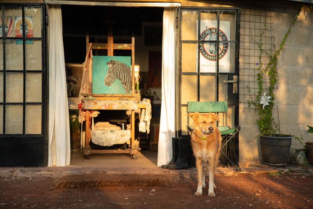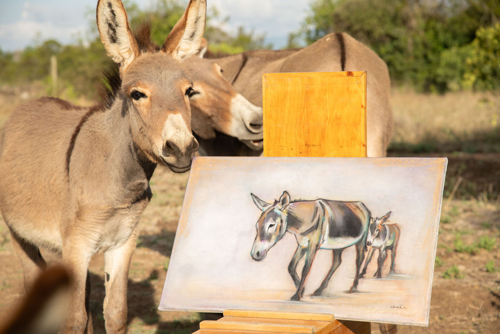 The name The Drawing Donkey is a nod to the humble bench easel where my artistic journey began. I create from my round-house studio in Northern Kenya, sharing life with my many dogs, a few chickens, and – true to brand – a handful of donkeys.